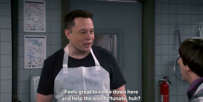 If you weren’t a big fan of Elon Musk in the 2010s, you might not know that he guest starred in an episode of The Big Bang Theory. Musk had cameos in many other productions, including Iron Man 2, The Simpsons, and South Park. But his cameo in TBBT now has ridiculous levels of irony, as he’s seen volunteering in a soup kitchen with Howard.