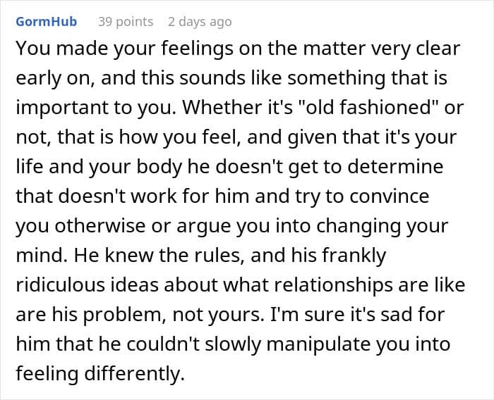 Readers assured the woman that she was right to stand by her values, and many warned her that it might be time to end the relationship