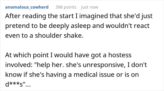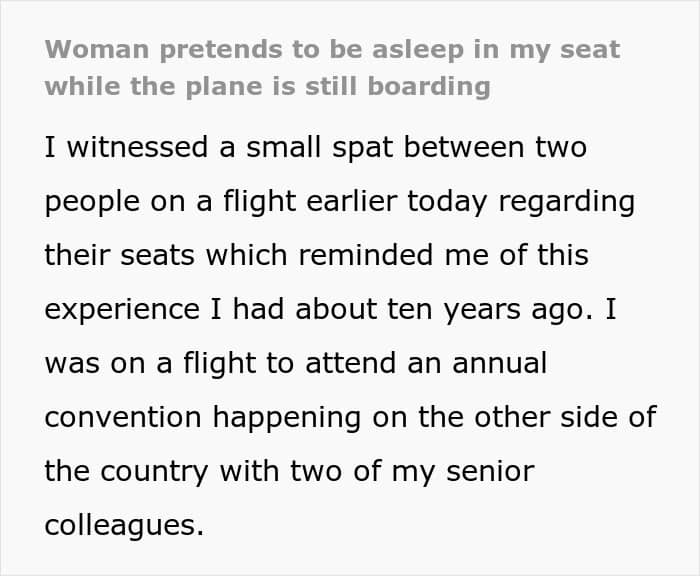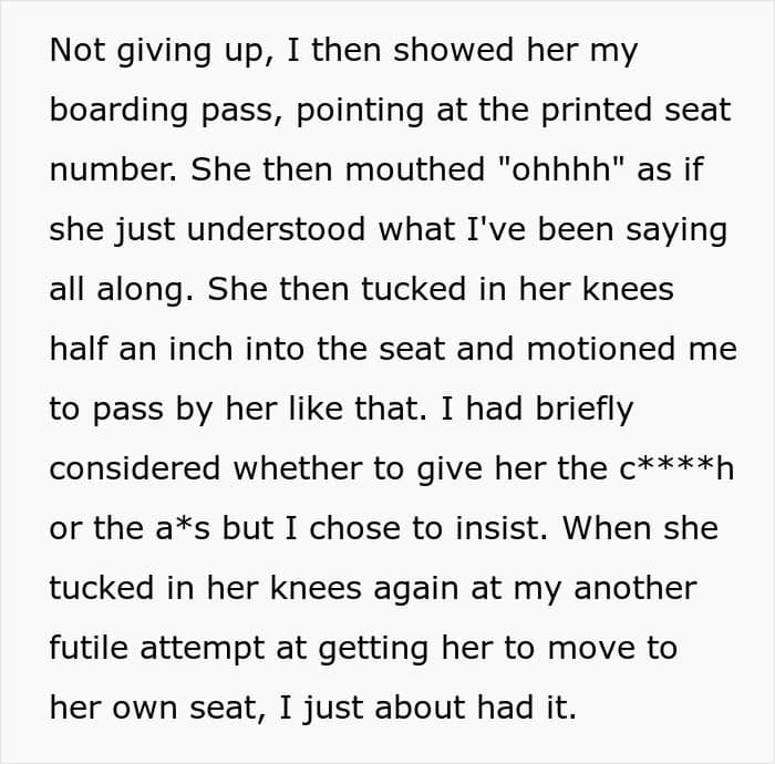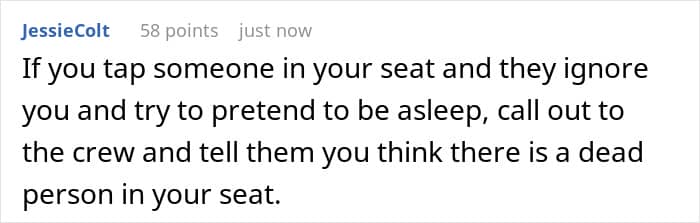 Unfortunately, half the plane hadn’t even boarded yet, making the act less “resting peacefully” and more “seat squatting,” so the OP tried to get her attention. Attempts to get her attention didn’t go smoothly. First came polite words, then gentle taps, and finally, showing their boarding pass.