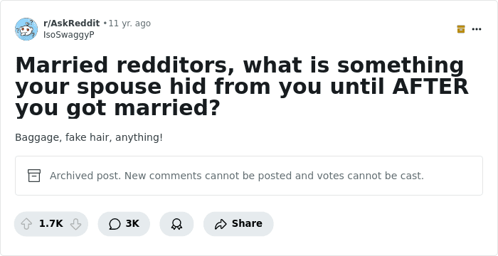 Divorced now, but she hid a bankruptcy, that she was a recovering coke a****t, and two additional divorces from me until after we married (I thought I was hubby #2, I actually was hubby #4.).