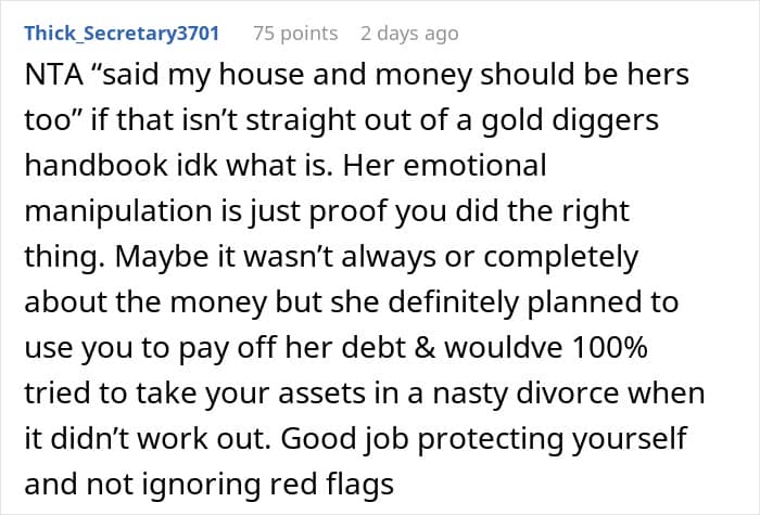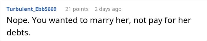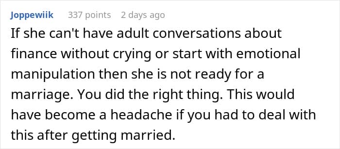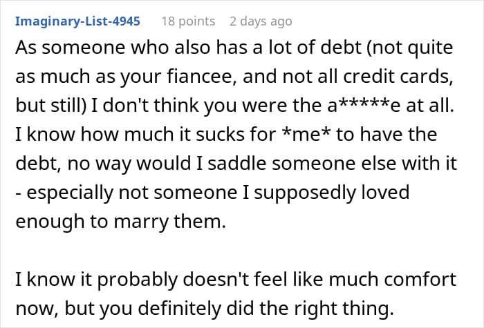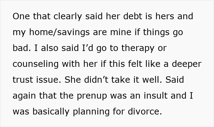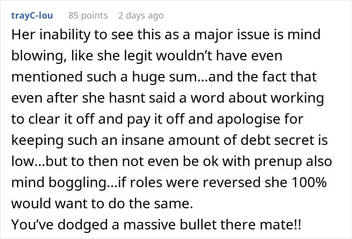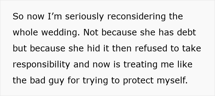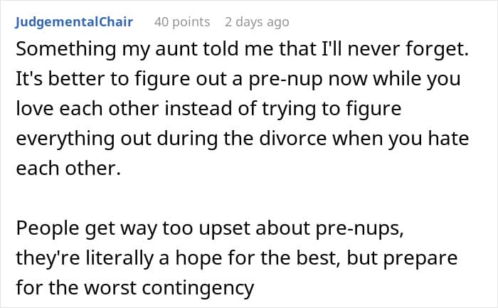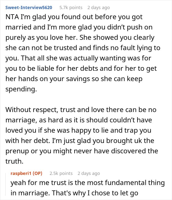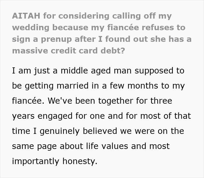 Redditor u/raspberi1 went viral on the AITAH subreddit and elsewhere online after opening up about an incredibly sensitive situation with his (now ex) fiancée. He shared how he wanted a prenuptial agreement with his future wife, and how he found out about her utterly massive credit card debt in the process. Scroll down for the full story. We has reached out to the author for comment, and we’ll update the article as soon as we hear back from him.