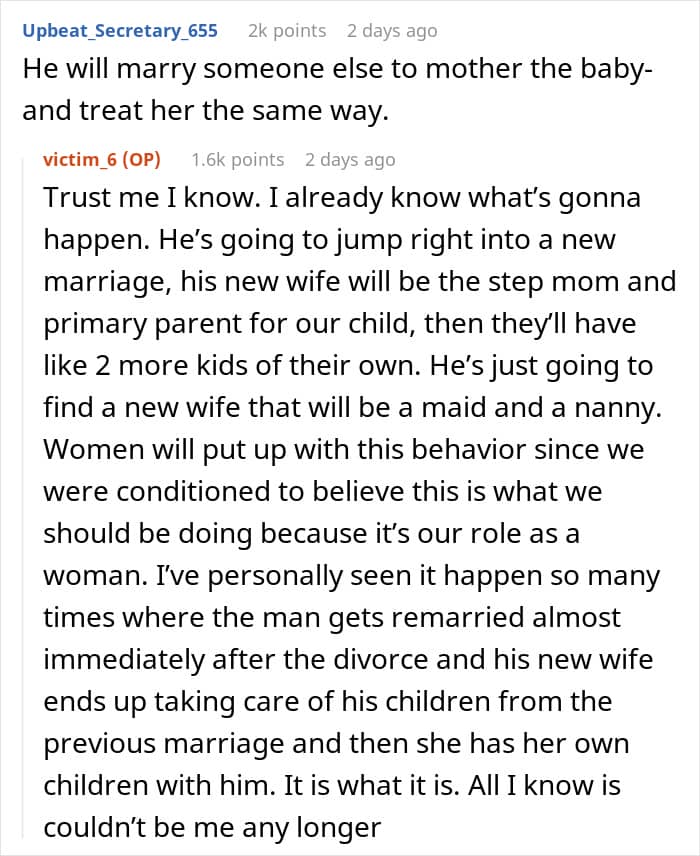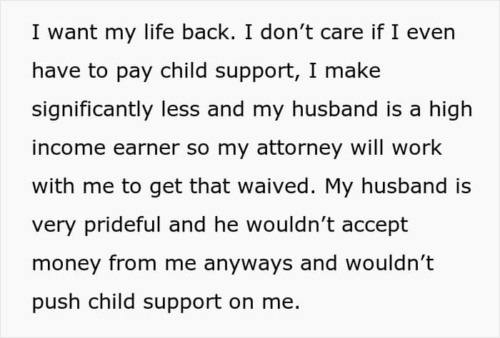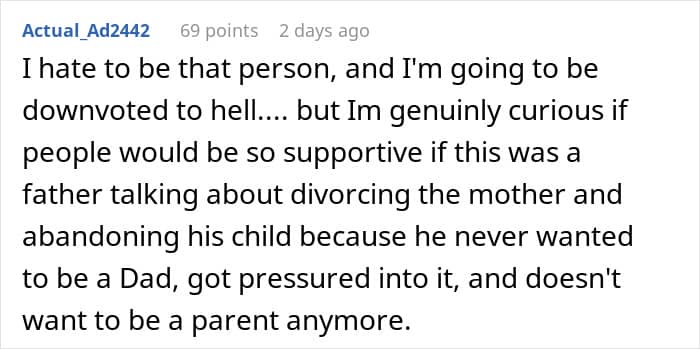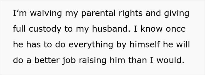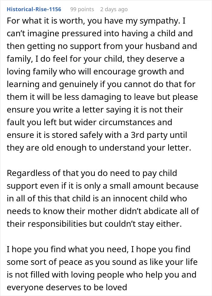 That’s what happened to this redditor, who was pressured by her husband and her family to become a mom. Even though “they said it would be different when you have your own child,” the woman hated being a mother and a wife; so, eventually, she reached a breaking point and decided to uproot herself from the life she detested and move on.