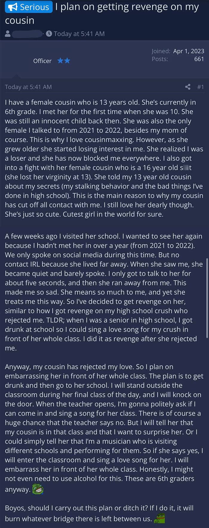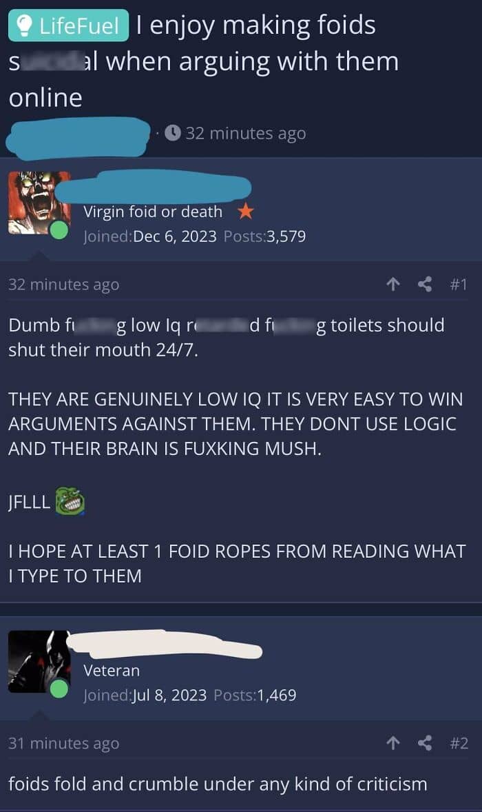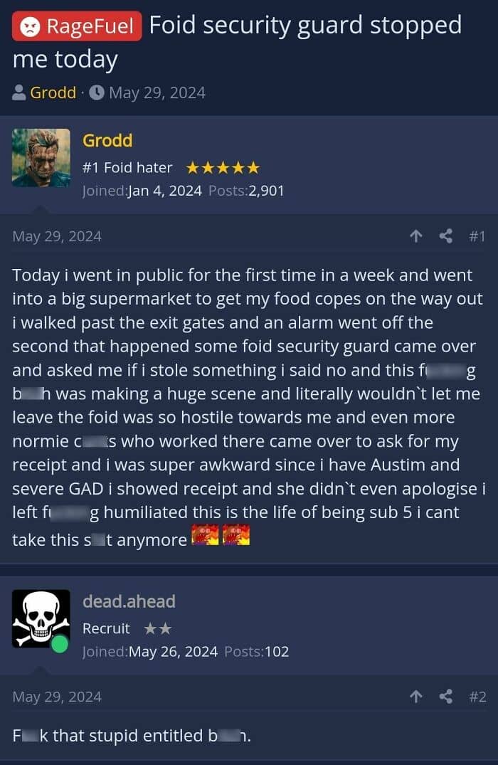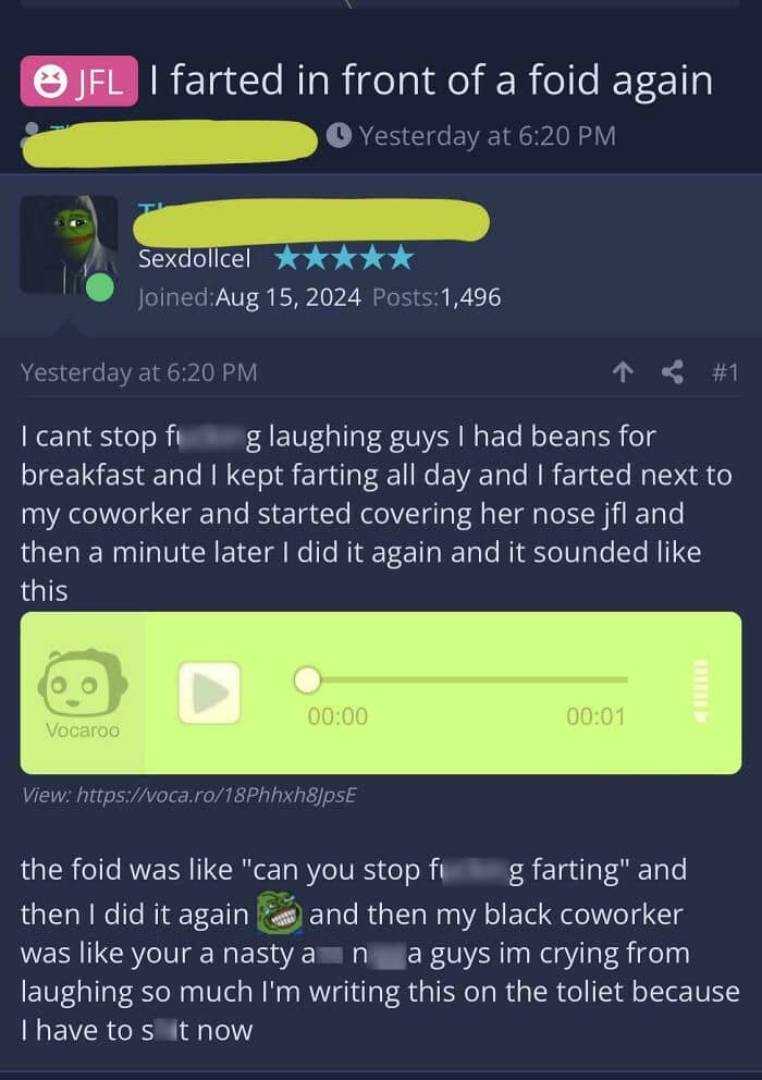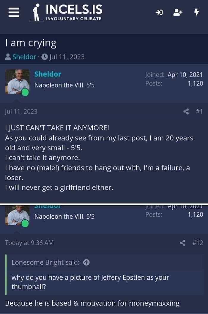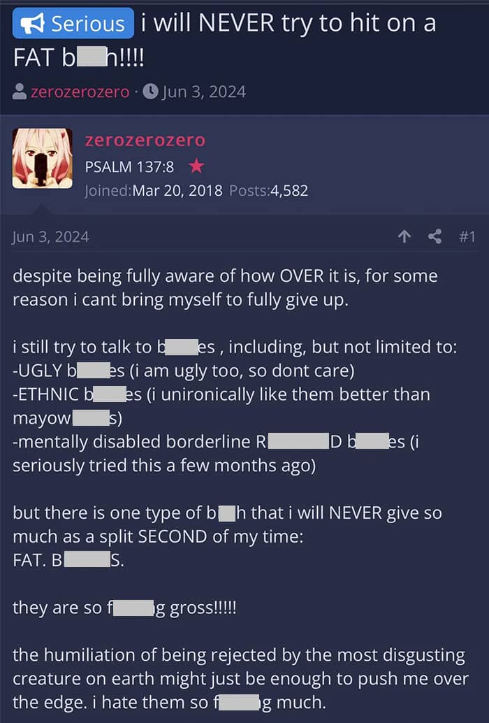 Many can be found in an online community called IncelTear. It’s basically a subreddit dedicated to posting screenshots of hateful, misogynist, racist, violent, and often bizarre content created by hateful “incels” (involuntary celibates). It has more than 129,000 members, and a wall of content outing “blackpilled incels.”