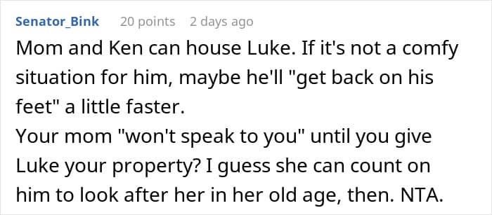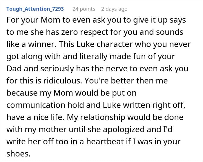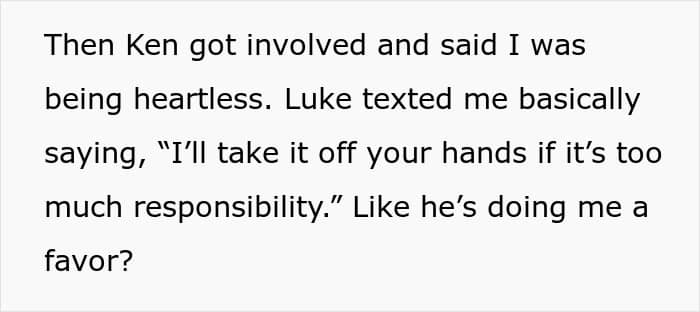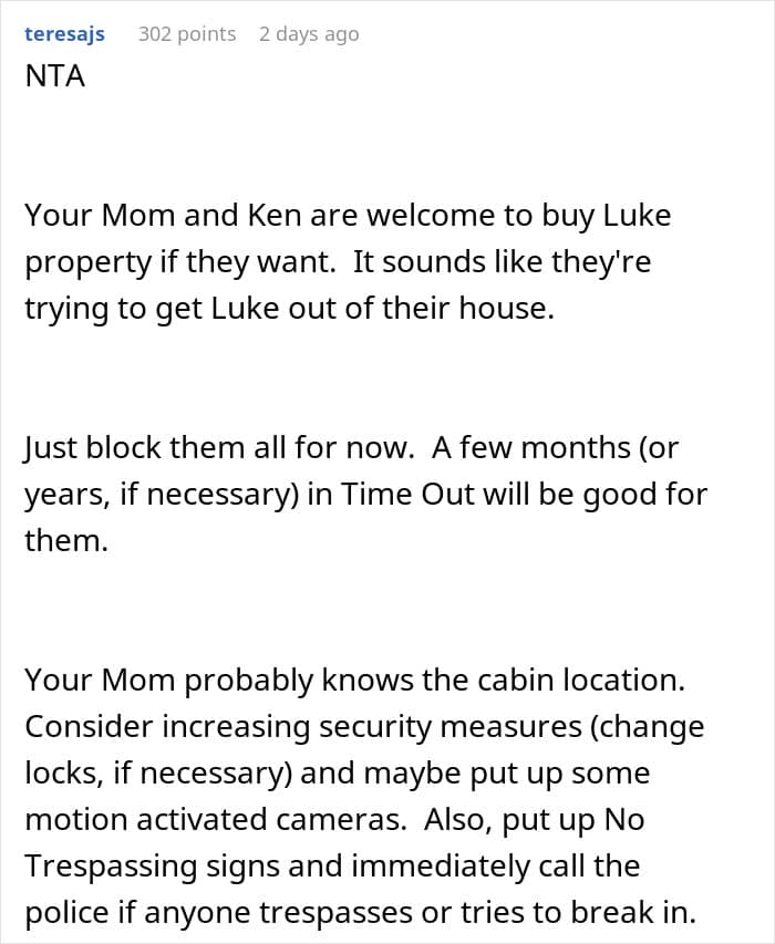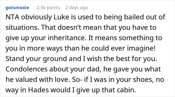 There’s also the issue of changing power dynamics. When someone suddenly acquires extra resources, they gain newfound flexibility, financial security, ability to make larger purchases, or capacity to help others in different ways. Relatives who were accustomed to the prior balance may feel a loss of influence or fear that their own needs will be deprioritized. In response, they may assert claims on the inheritance, not purely out of greed, but as a way to reestablish equilibrium in family relationships. In this story, they seem to truly believe that she has a moral responsibility to “help” her stepbrother. However, her family also muddy the waters, as they insist they literally give him the cabin instead of just allowing him to stay there for a bit.
