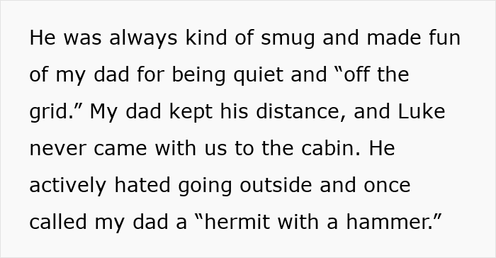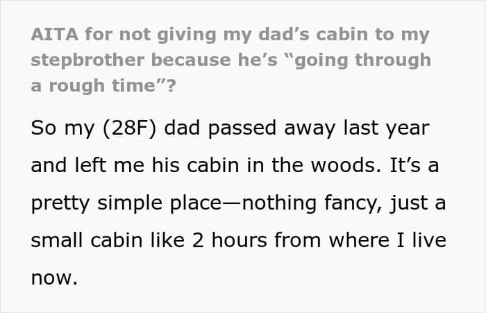 A woman asked the internet if she was wrong to categorically refuse to give her stepbrother a cabin she inherited from her late father. Her family insisted on guilt tripping her over and over again, arguing that he needed it more than her. We reached out to the woman who shared the story via private message and will update the article when she gets back to us.