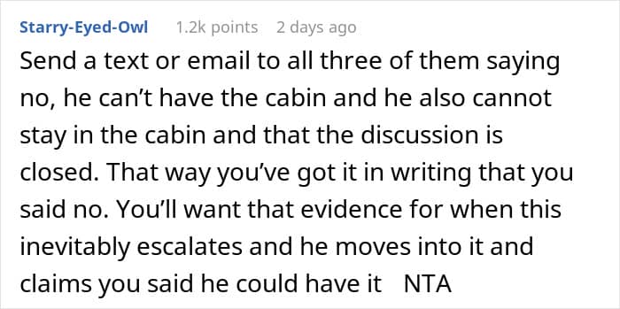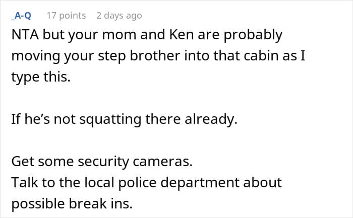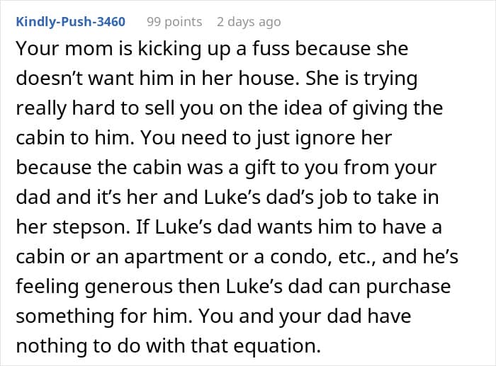 So one woman wondered what to do when her relatives wanted her to hand over a cabin to her stepbrother
