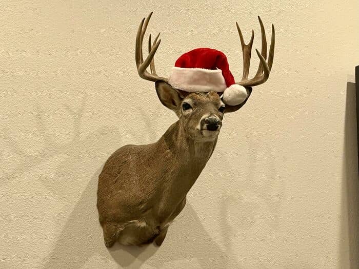 My husband has a gigantic bull elk on the wall in his study. Our first Christmas I decided I would decorate him with a Santa hat and scarf. He loved the hat but the scarf was apparently too far. According to my husband, it emasculated him. Male elk don’t wear scarves. 🙄 10 years later we are still happily married and it remains one of our biggest fights.