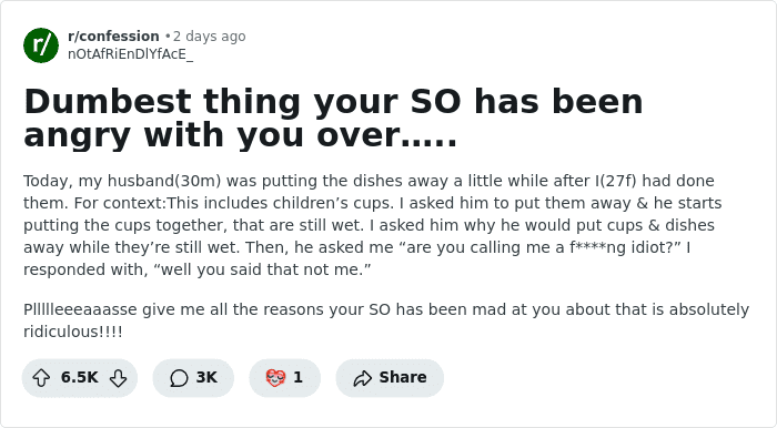 This delightful descent into relationship chaos began when someone shared a story about asking her husband why he was putting away wet dishes, only for him to ask if she was calling him an idiot. Amused, that led them to encourage fellow netizens to share the most absurd reasons their significant others have ever gotten mad at them. And as usual, we’ve gathered the funniest and pettiest reasons for your reading pleasure.