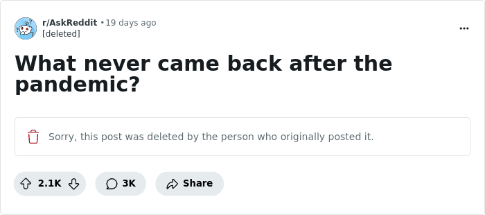 A few weeks ago, a thread appeared in the AskReddit community, urging netizens to answer one question: “What never came back after the pandemic?” The thread turned out to be very lively (around 2.1K upvotes and over 3K various comments), incredibly atmospheric, and very nostalgic. Well, of course, not without a bit of humor.