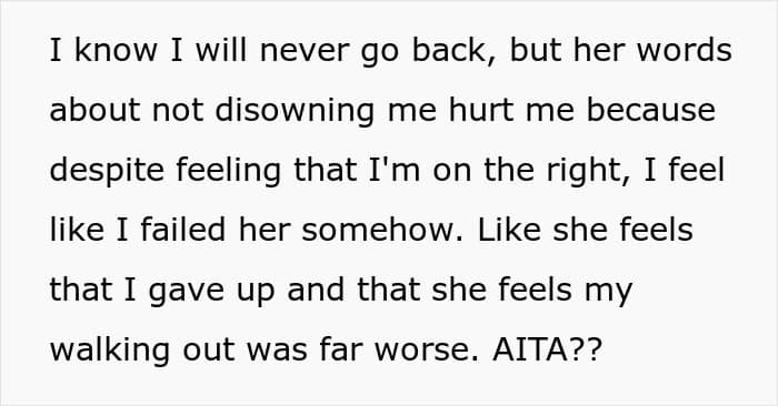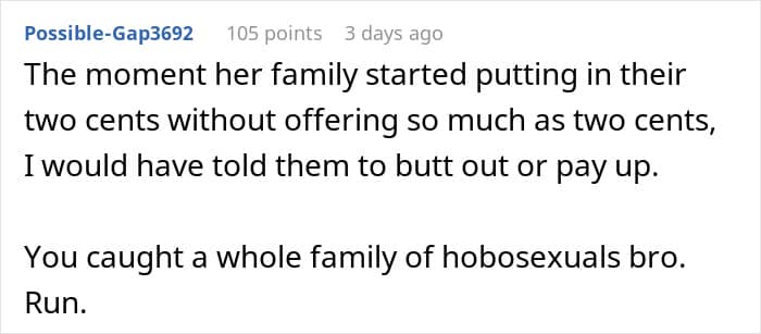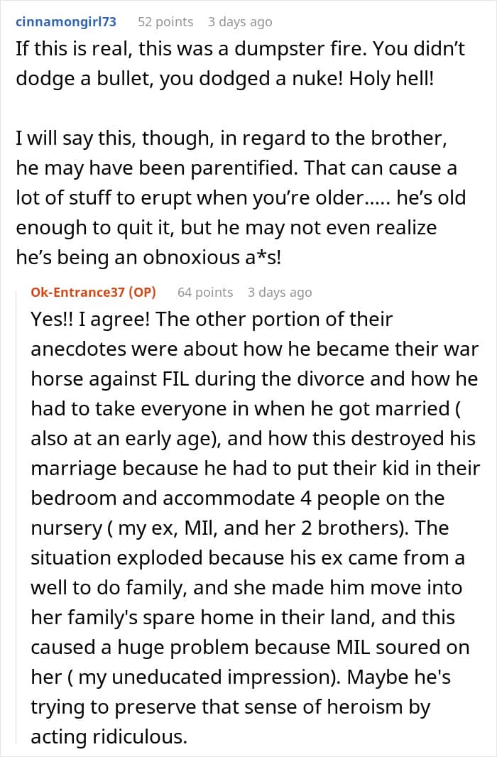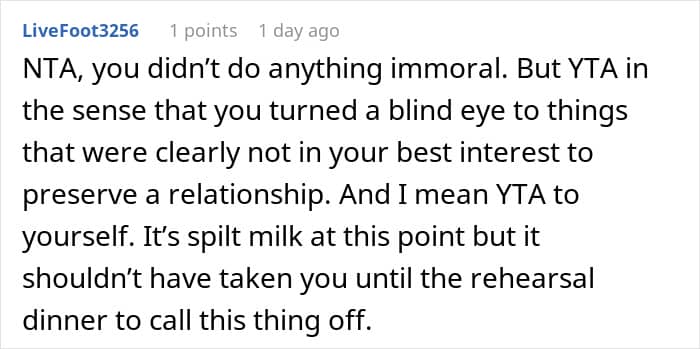 In the author’s case, he made a sound judgment call by breaking off the relationship. The woman showing little support to him and siding with her family was the last straw, and he made the right call by choosing practicality and his sanity.
