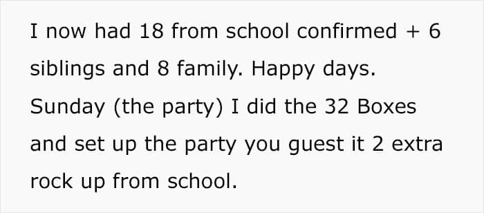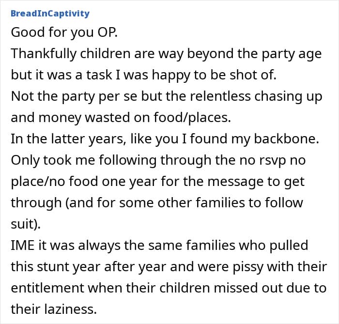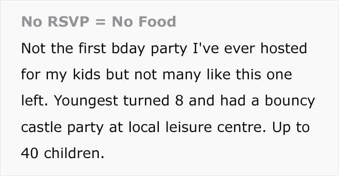 Beyond logistics, RSVP’ing also shows basic respect. If someone invites your child, it means they want them there. Not responding at all can feel dismissive, as if the invitation didn’t matter. Even if your child can’t attend, a quick reply lets the host know where things stand and prevents them from holding a spot for someone who isn’t coming. It’s a simple act of consideration that helps everyone involved. These parents didn’t care, even if it meant their kids might not eat, which might be a quintessential example of entitlement.