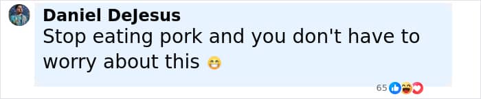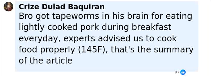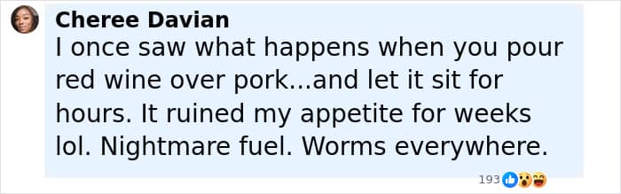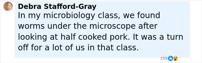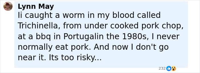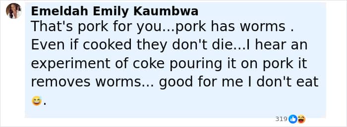 “That’s pork for you…pork has worms. Even if cooked they don’t die…I hear an experiment of coke pouring it on pork it removes worms… good for me I don’t eat,” wrote one person.