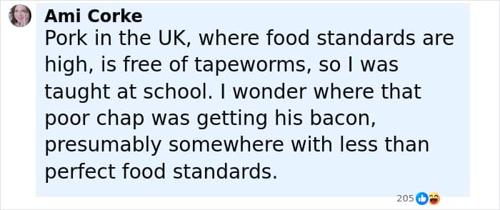 “I wonder where that poor chap was getting his bacon, presumably somewhere with less than perfect food standards,” she said.