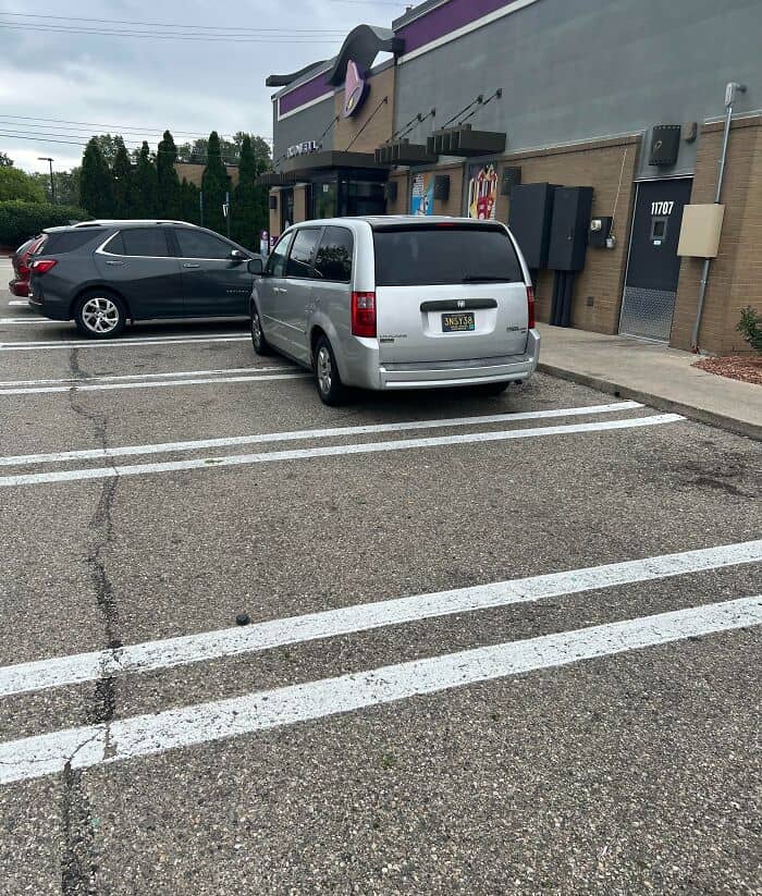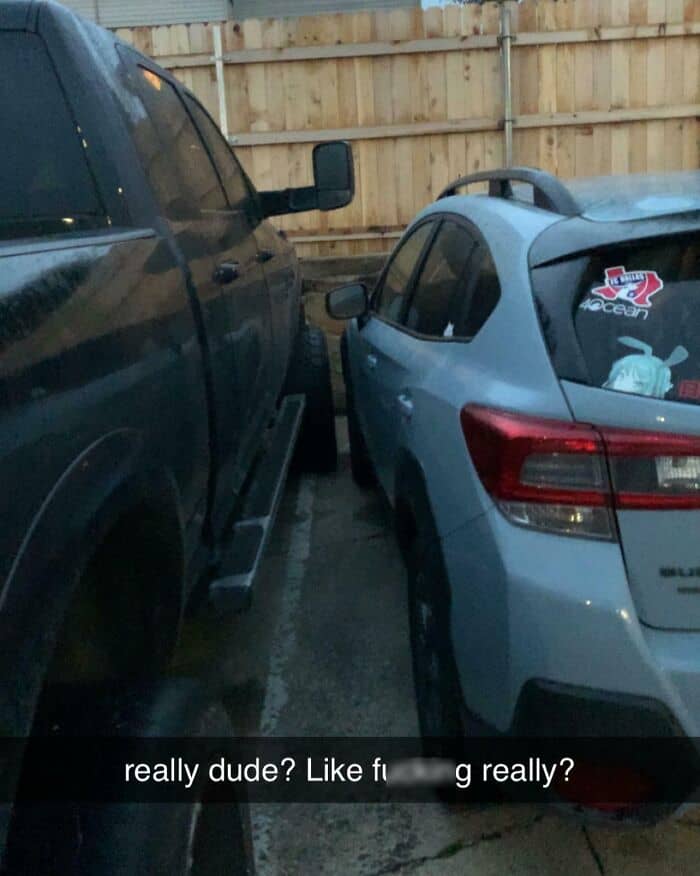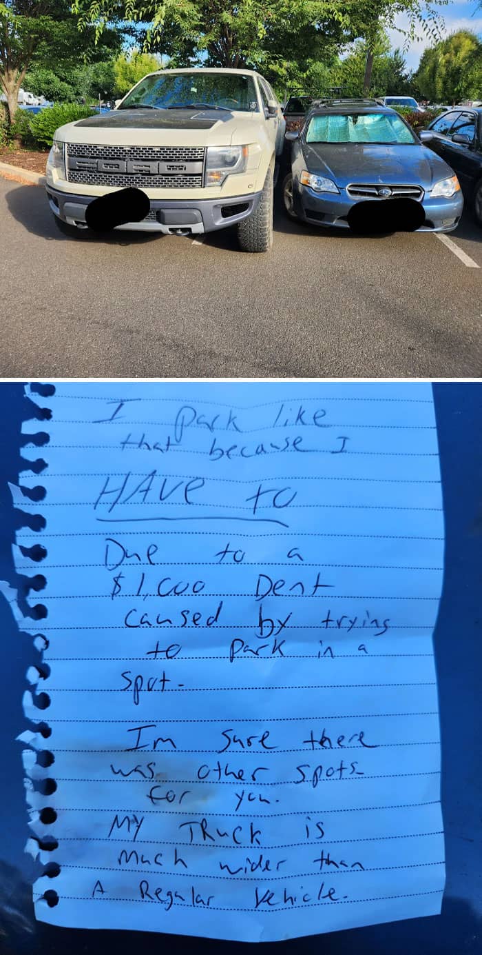 “I park like that because I HAVE TO. Due to a $1000 dent caused by trying to park in a spot. I’m sure there were other spots for you. My truck is much wider than a regular vehicle.”