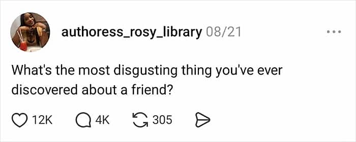 I thought we were gonna be talking about “gross” disgusting things, not “mentally” disgusting things. Anyway, I was friends with this girl in HS and every time I went to her house, her room and bathroom were always a disaster, like you couldn’t see the floor. And she would always leave used pads in the bathroom floor and dirty underwear everywhere. She acted like she was hot s**t around everyone and a total monster to other girls.