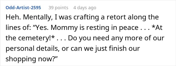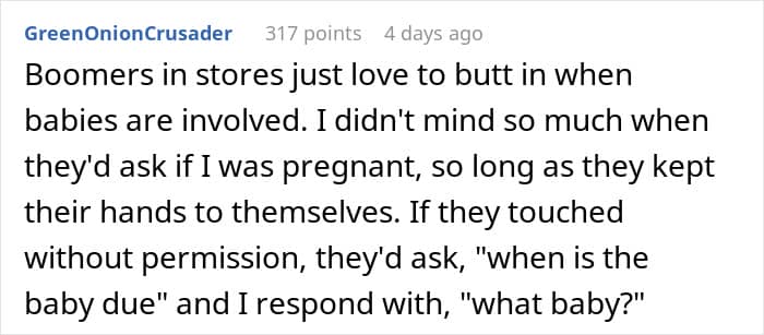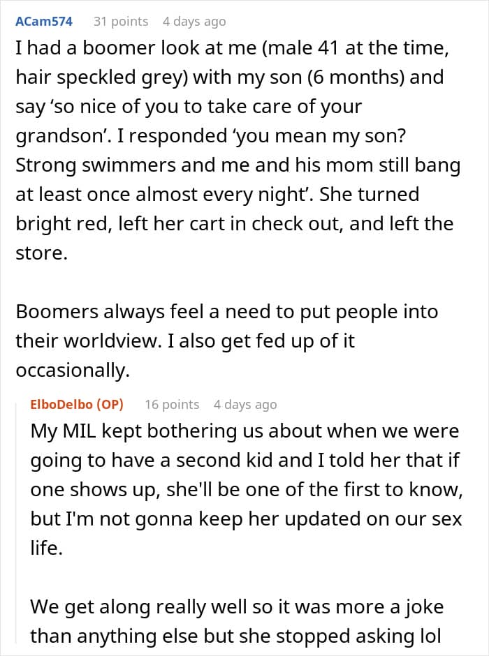 Just like this woman, whom the father of the story called “some Boomer.” Every time she would see the dad and son in a grocery store, she would shoot the unfortunate phrase, “Must be mom’s day off!” Getting fed up with the elderly person, the parent clapped back, leaving her speechless.