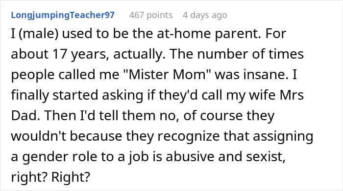 “Similar to how mothers often receive unsolicited advice on mothering, there is no great answer to these remarks,” explains Wilson. “I’m a fan of educating people through role modeling healthy behaviors and ignoring comments that aren’t empowering the parent in their identified role. People who make remarks like this have their own work to do around gender stereotypes and relationship equality and are likely not going to learn much from a momentary rebuttal.”