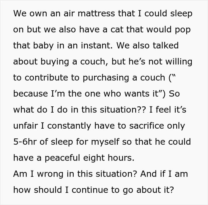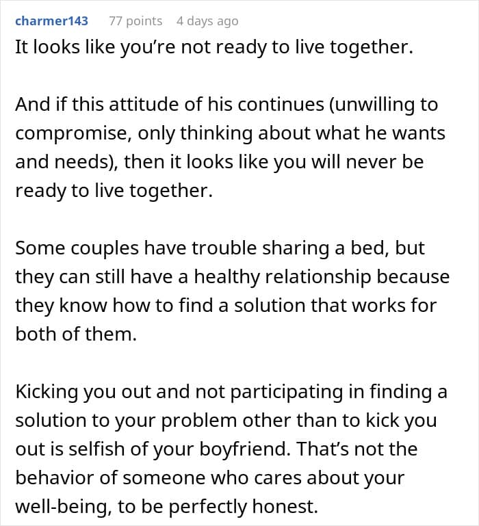 Redditor u/Cucumbertrees asked the r/AITAH online community for advice regarding a sensitive situation at home. Her boyfriend recently started working nights, so he comes back home really late (or early, depending on your perspective). However, in order to get some rest, he asks the author to leave the bed so he can sleep ‘properly.’ Scroll down for the full story and the advice the internet gave the woman. We has reached out to the author via Reddit, and we’ll update the article as soon as we hear back from her.