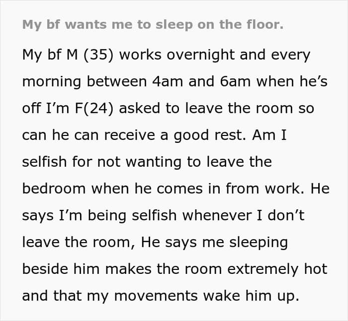 One woman asked for advice after her boyfriend, who works nights, asked her to leave the bedroom and sleep elsewhere