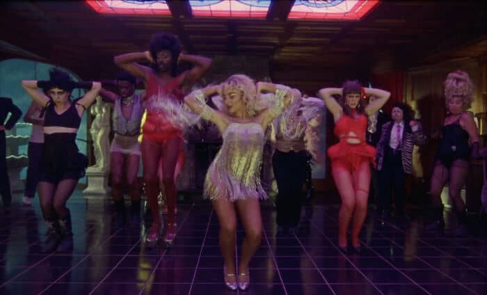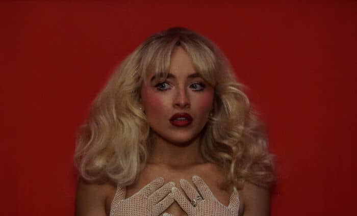 The routine sees Carpenter trying to elicit a reaction from the guard, and seeing no other way to make him emote, she proceeds to get on her knees in suggestive fashion, causing the dancer to finally look at the camera and blink.