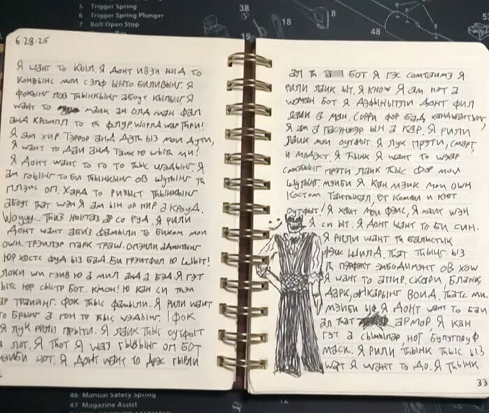 “I also love when kids get shot, I love to see kids get torn apart,” the suspect wrote in a journal entry before unleashing the horror.