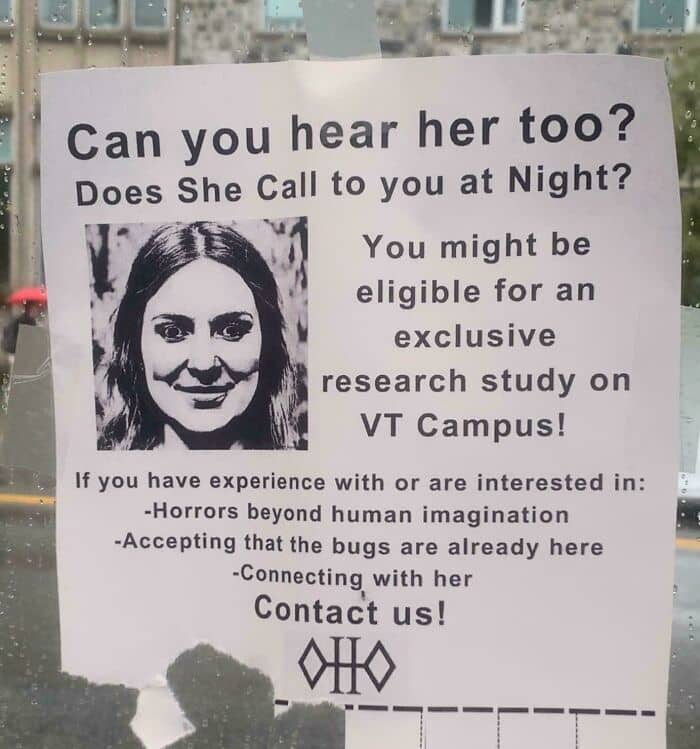 I found this missing person’s at a parking lot at Best Buy. I thought it was another normal missing persons flyer, but until I took a closer look I noticed the weird picture the description and the additional info. Is this some promotion for like a movie or an ARG?