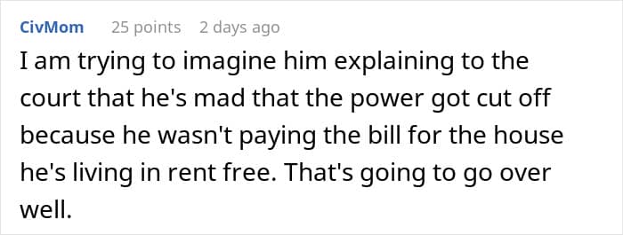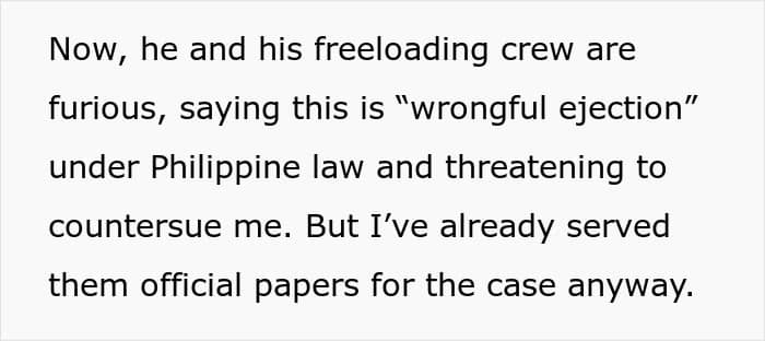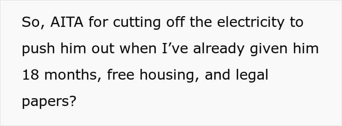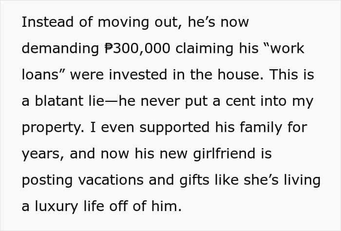 Now, instead of moving out like a normal person, he’s demanding ₱300,000, claiming he invested in the house, which is a lie, of course. This is over $5,000, and during all of this, he also found a new girlfriend, who is posting luxurious stuff on her socials. OP just snapped, and cut the electricity to the house, but now all the freeloaders are accusing her of wrongful ejection.