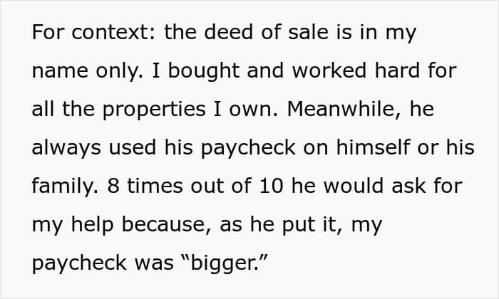 Dear readers, let us drop some interesting numbers on you. The average cost of rent in the Philippines is anywhere between ₱17,000 to ₱37,000 ($297 to $648) per month. This wretched man has lived free of cost for over 18 months, and that’s a lot of money, looking at the data, isn’t it? Yet, he shamelessly wants to mooch more money from her—it’s like his greed has no limit!