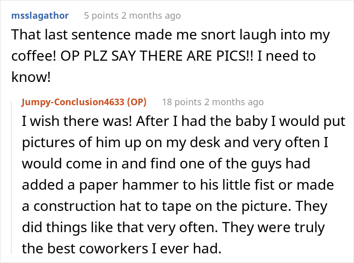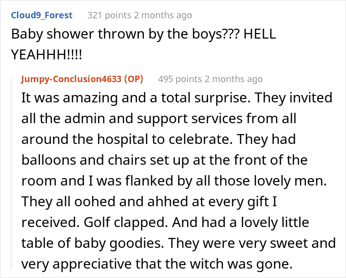 According to the OP’s words, she was called to the HR department half an hour later, while Karen’s desktop was turned off and she definitely hadn’t had time to read the OP’s response yet. The head of the HR department told her to go home and gave her admin leave for 3 extra days. When the OP returned to the office, Karen’s desk was already empty, and they never saw her again. And three months later, the whole department gave the OP a wonderful baby shower.