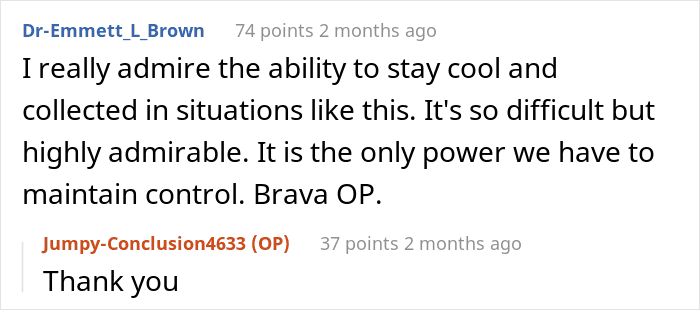 Most of the commenters were delighted with the outcome of this story and praised the OP for her ability to stay cool and collected in difficult situations like this one. According to people in the comments, it is the only power we have to maintain control.