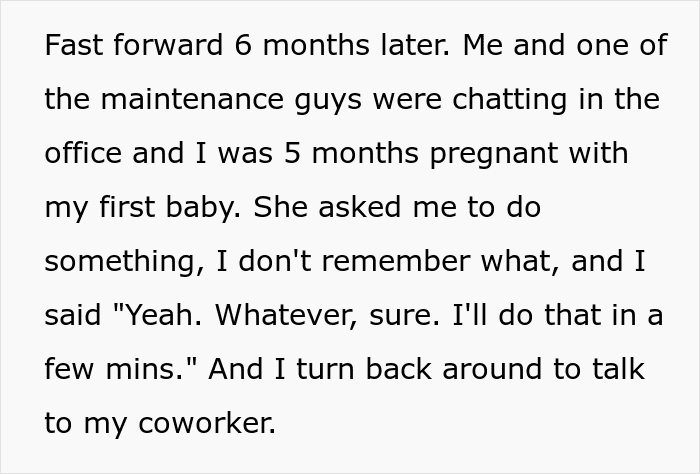 Six months later, when the OP was pregnant, her manager insulted her in a rather common situation