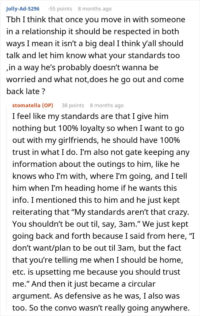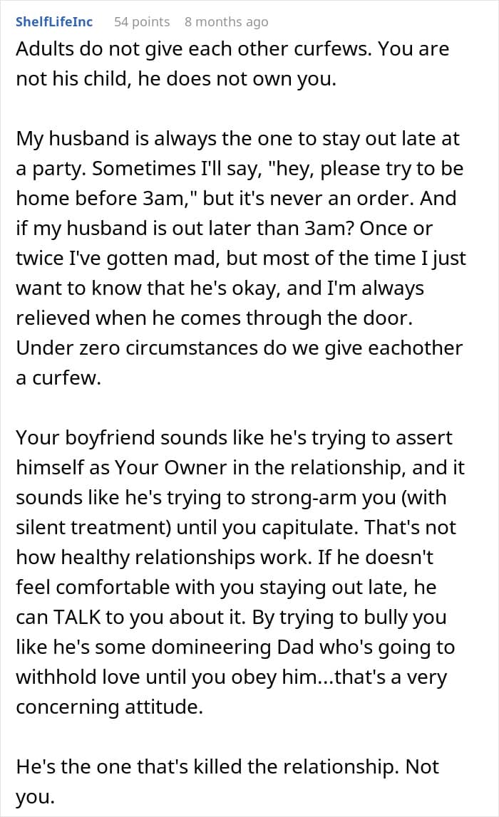 When she wanted to go out with friends, he insisted on a curfew: “These are my standards”