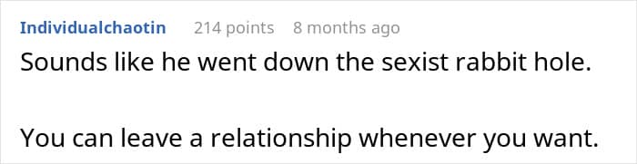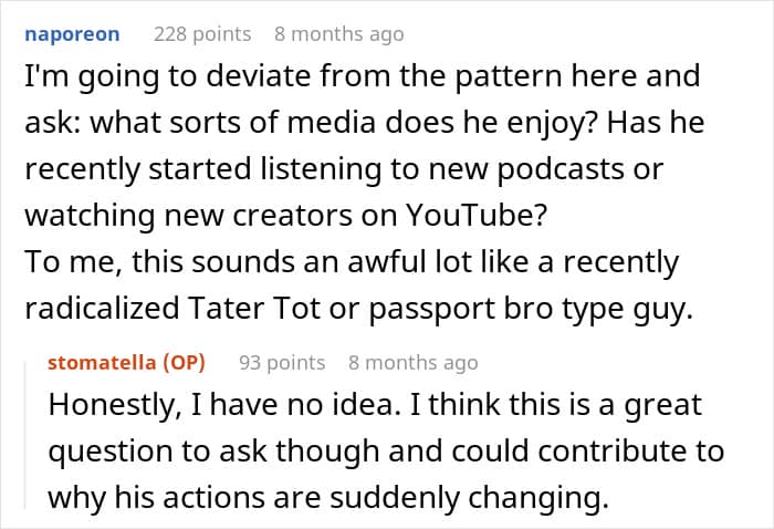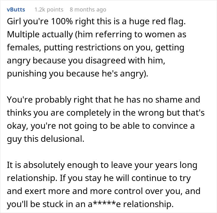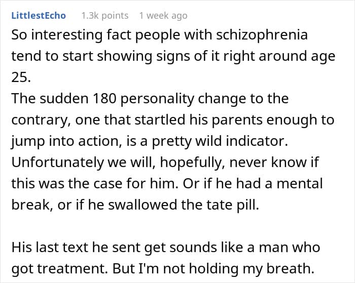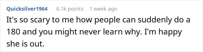 This Redditor’s story is scary and definitely not something anyone would want to experience. People in the comments speculated what could have caused the boyfriend’s sudden behavioral changes, guessing everything from the boyfriend possibly getting red-pilled online by the Manosphere to the onset of schizophrenia.
