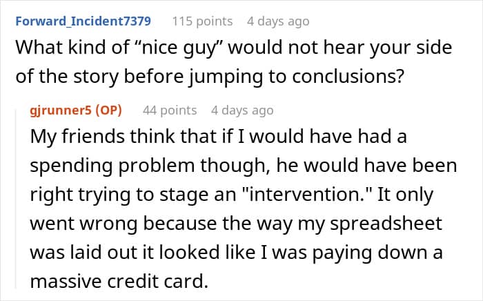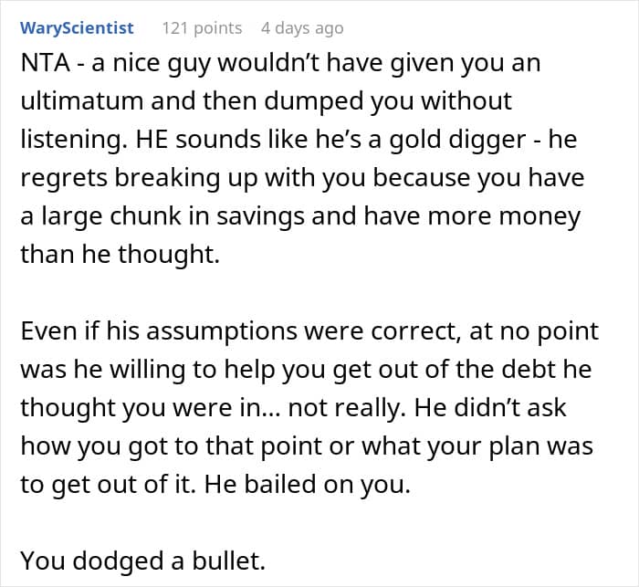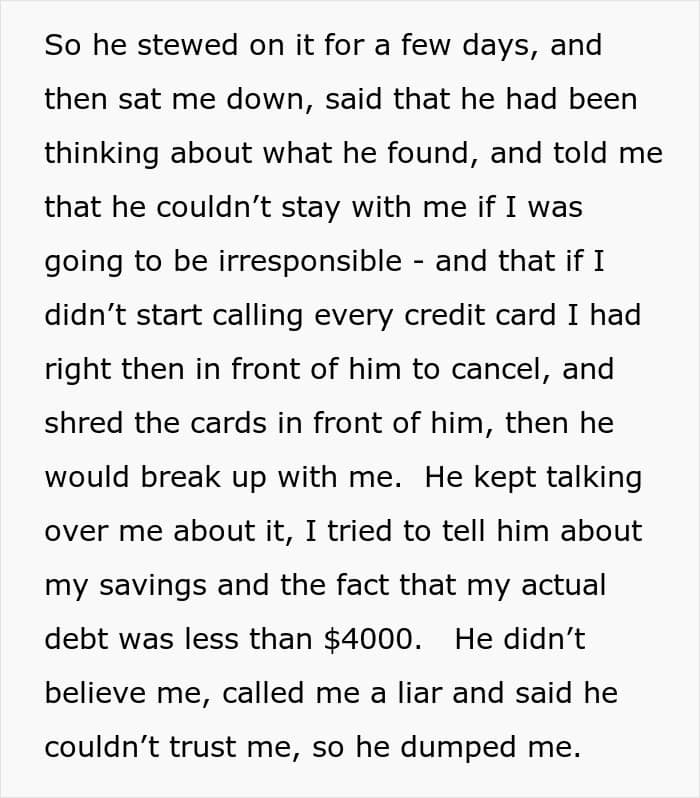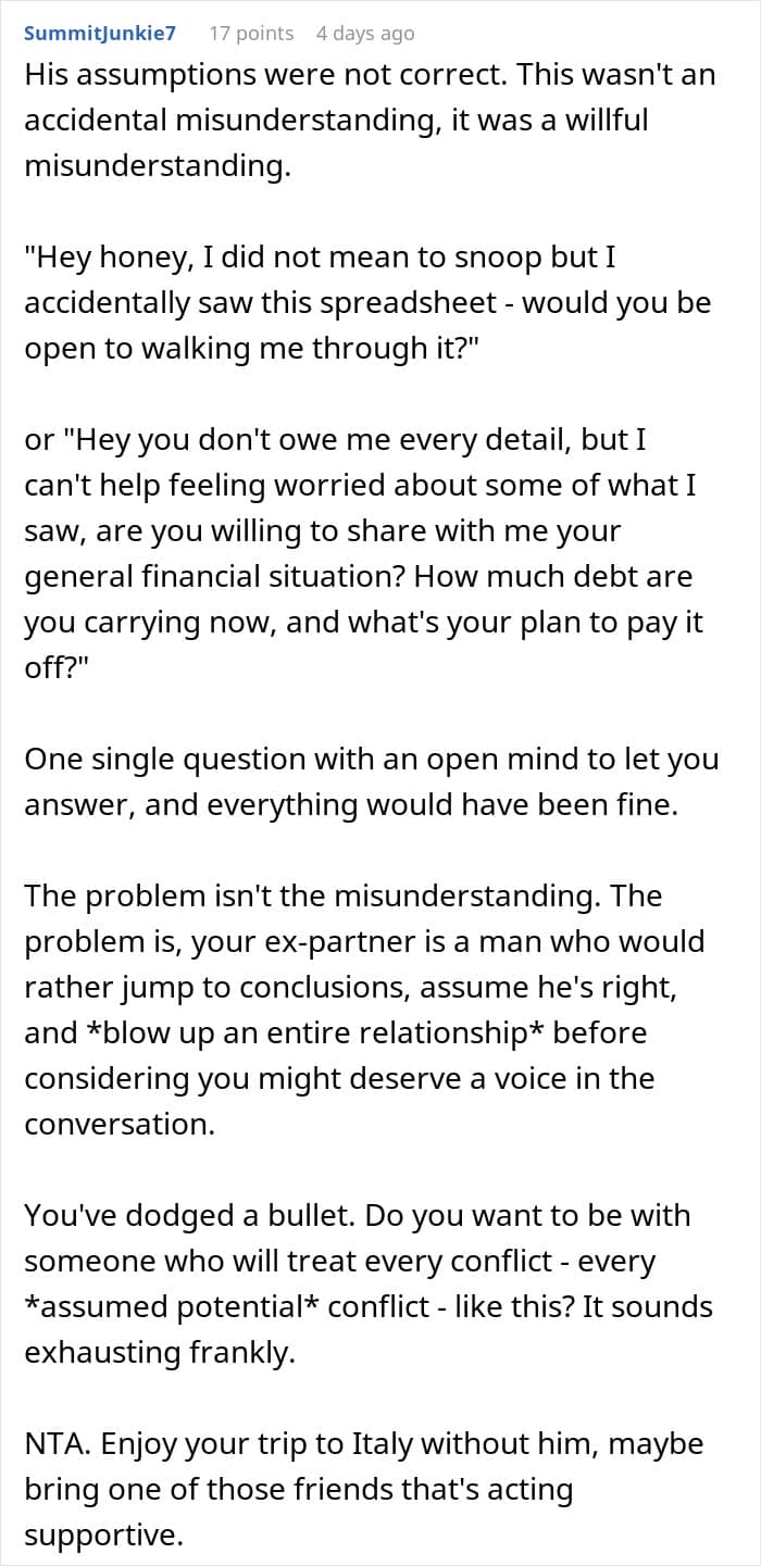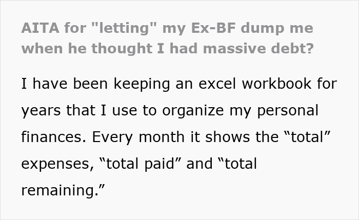 Redditor u/gjrunner5 went viral after asking the AITAH online group for an impartial verdict about a messy misunderstanding between her and her (now ex) boyfriend that got out of hand. She shared how he misinterpreted a spreadsheet of her finances and believed that she had taken on massive debt. After delivering an ultimatum, he broke up with her, and only later realized that he’d been completely wrong. Scroll down for the full story and the internet’s reactions.