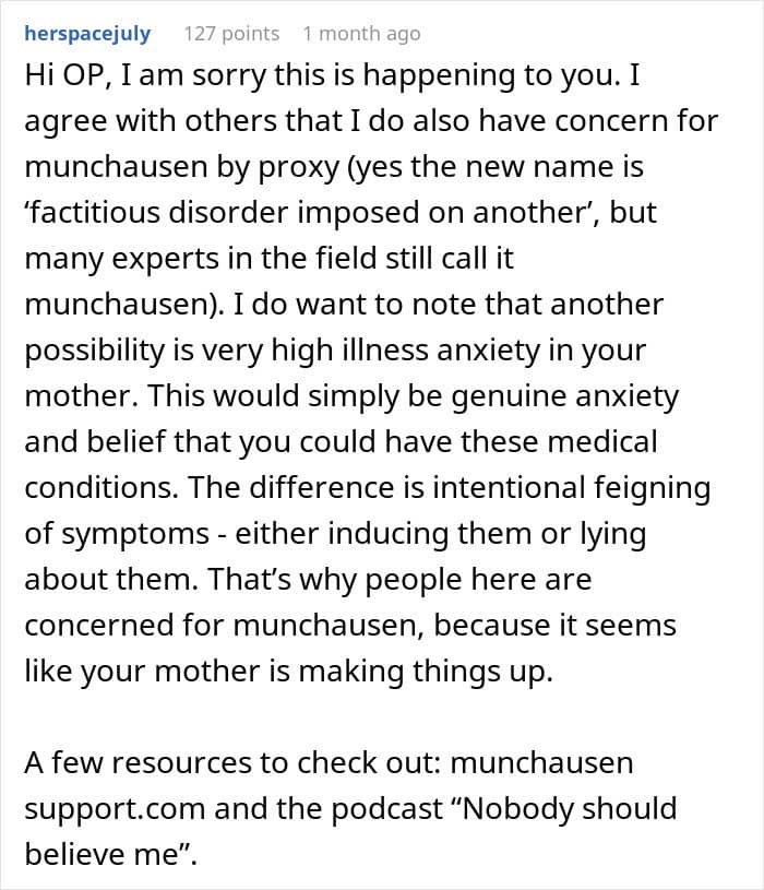 Many of the doctors mentioned Munchausen syndrome when responding to the teen. If you’re not familiar with the term, it is a psychological condition where someone pretends to be ill or deliberately produces symptoms of illness in themselves.