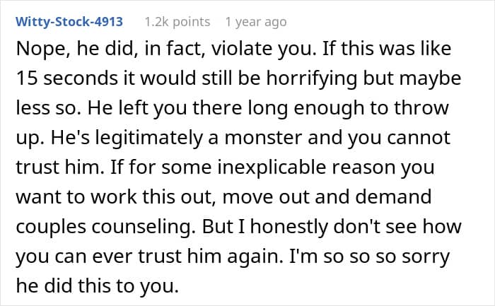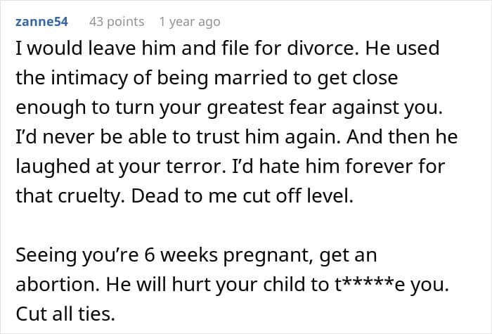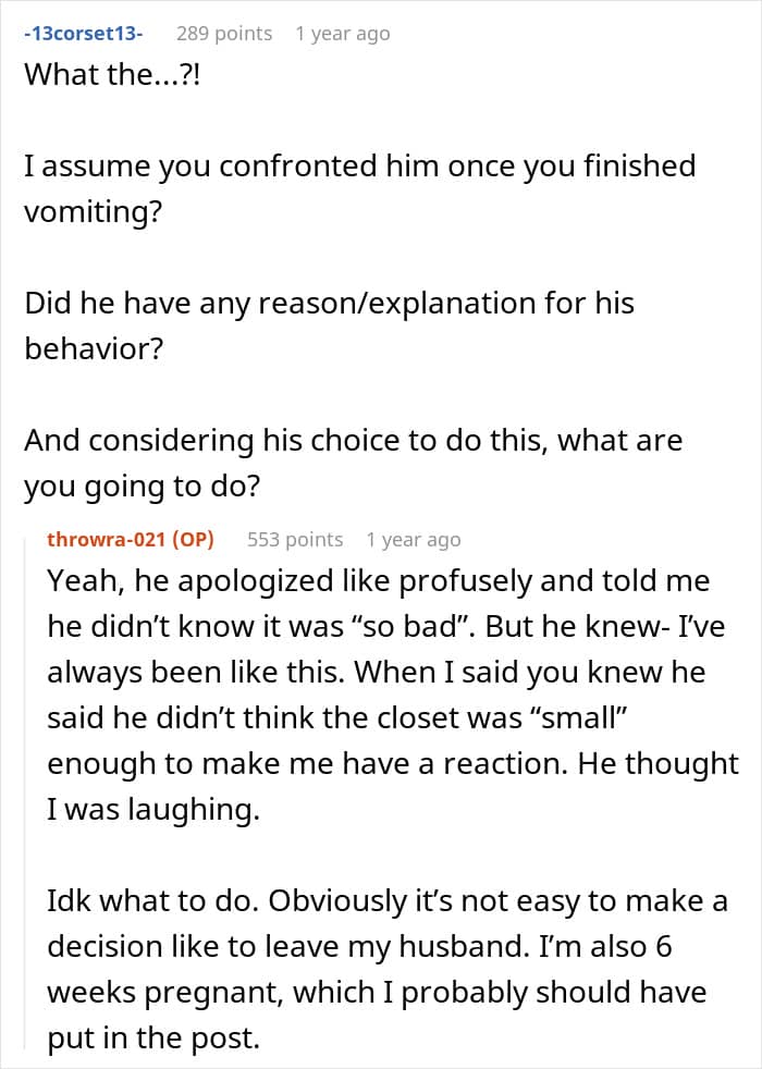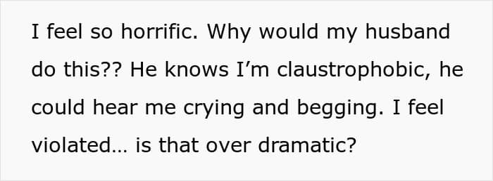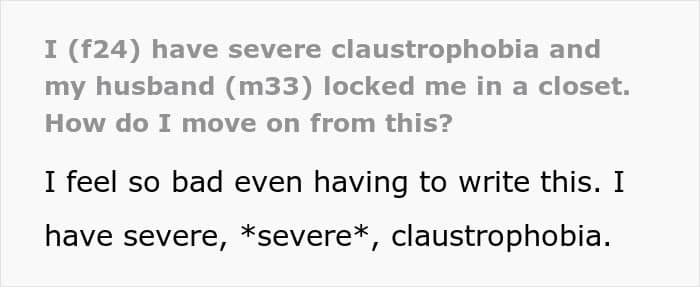 On r/Relationship_Advice, one woman described how her husband ignored not just her comfort but also her deepest fear. Living with severe claustrophobia, she said he deliberately trapped her in a closet, laughing while she begged to be released.