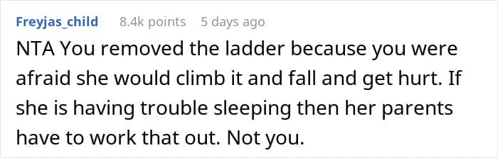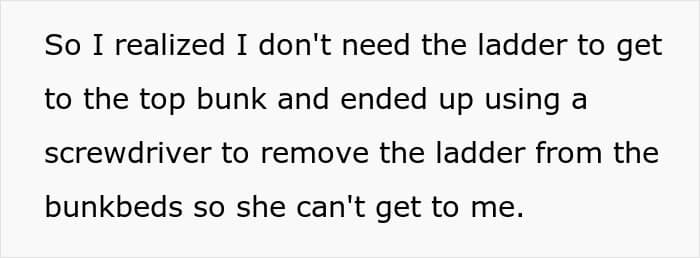 So, the teen came up with a plan – she grabbed a screwdriver and removed the bunk bed ladder entirely. Out of sight, out of climb. Problem solved… for the OP at least. Because her niece, on the other hand, stopped getting much sleep at all.