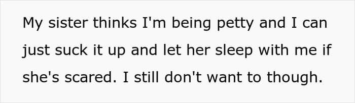 It got so bad that her exhaustion was noticed at school, sparking concern from the teachers and landing the parents in hot water. This started the family finger-pointing, with the OP’s sister accusing her of being selfish and petty for prioritizing her sleep over her niece’s fears. But is she really wrong here?