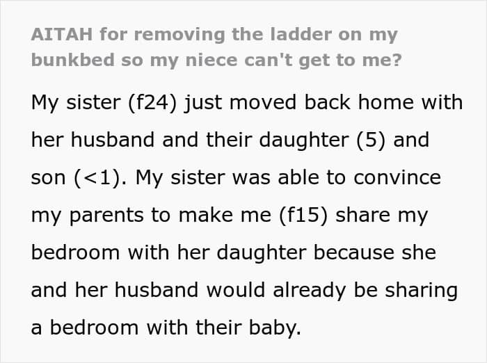 The 15-year-old OP (original poster) had her peaceful life turned upside down when her older sister returned home with her husband, a baby, and a 5-year-old, who ended up being her brand-new roommate. To make space, the OP’s beloved bed was swapped for a bunk bed, with her on the top level and her niece on the bottom.