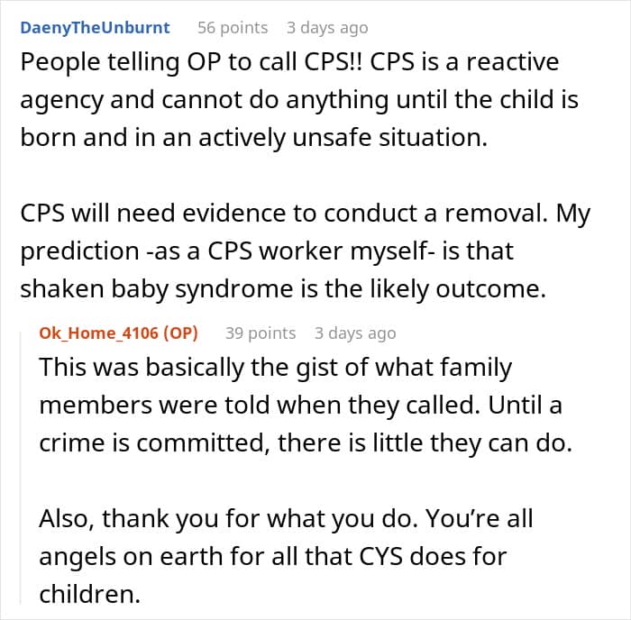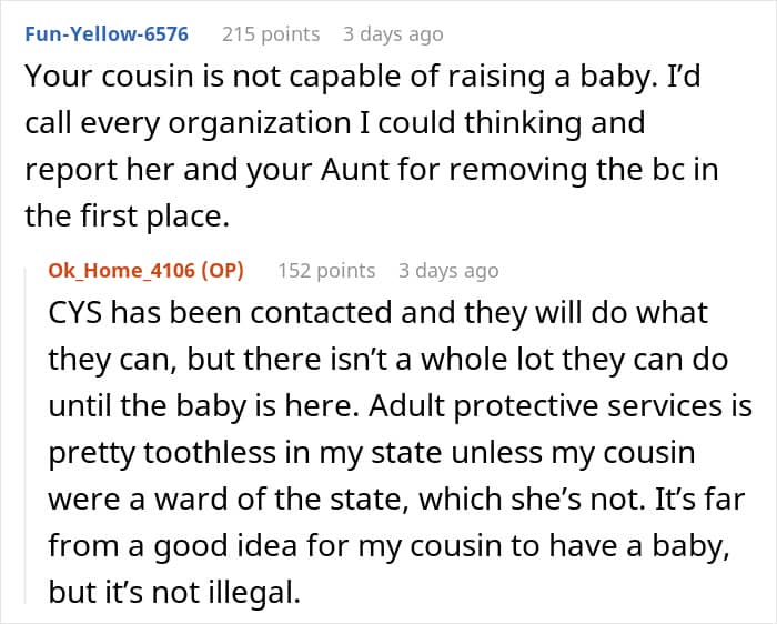 Netizens agreed that the OP’s cousin is not capable of safely raising a child and suggested contacting child welfare services, though some clarified that agencies like CPS can only intervene once the baby is born and in danger. Others reassured the OP that she was right to set boundaries, emphasizing that she is under no obligation to provide baby items.
