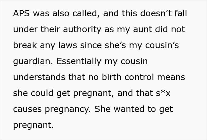 The OP noted that her cousin, adopted at birth, has lived her entire life with a cognitive disability. Her development is around that of a 10-year-old, and she struggles with impulse control and emotional regulation. Family members had even long agreed she shouldn’t be left alone with young children because of her history of lashing out when upset.