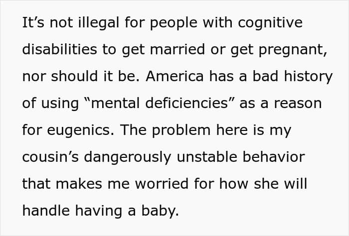 That’s exactly the struggle in this story. Today’s Original Poster (OP) shared that her cousin with significant cognitive disabilities is about to become a mother, with her own mother cheering her on, but not everyone in the family shares that excitement. After she refused to support it, she found herself being called cruel for it.