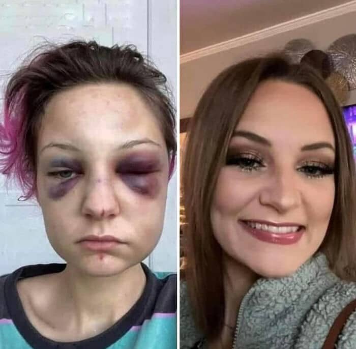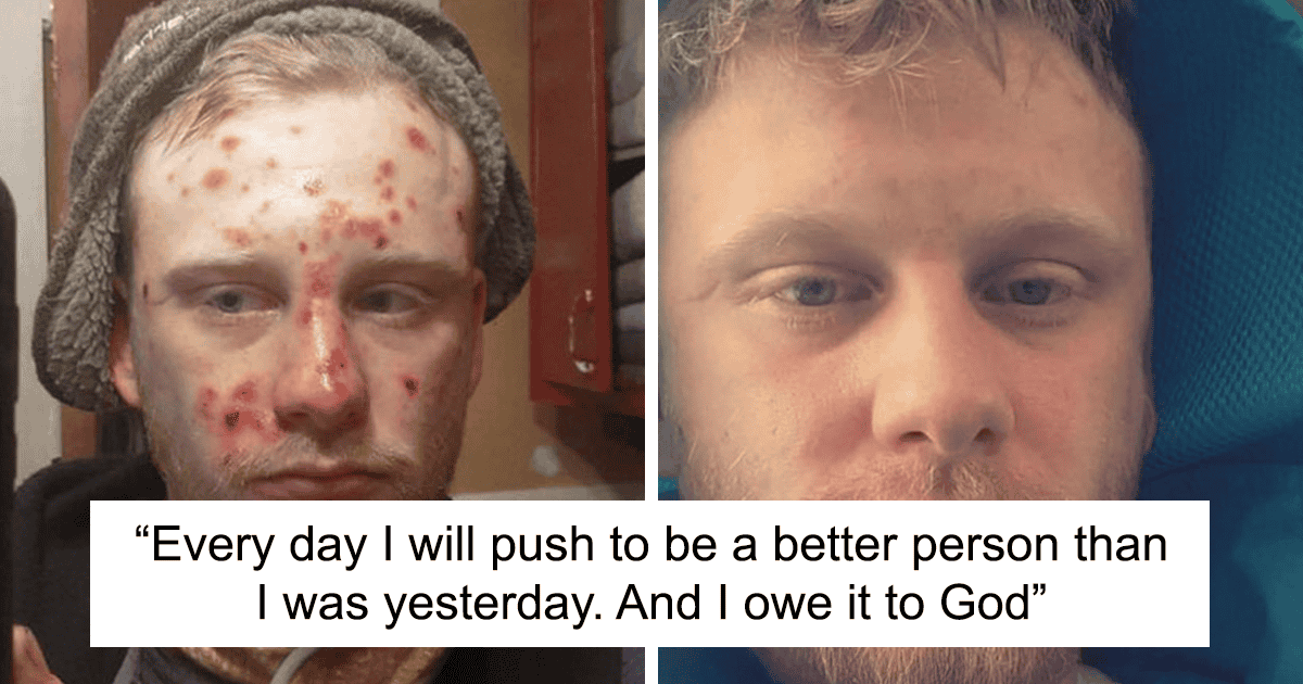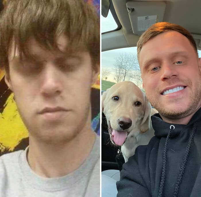 “This was right after my facial reconstruction surgery. I was hammered drunk and ended up in a big fight and got the whole left side of my face smashed to pieces. Most can’t tell (so grateful for that surgeon) but I have 30+ titanium plates in my face. The surgery was almost 10 hours long. The recovery was the worst part. I had to sleep sitting up in a chair. Couldn’t even lay down for months and I was popping painkillers like candy. Butttt I guess God thought I was a little too sexy so He had to rough me up a bit. And the other pic is me now. About 60 pounds heavier than I was then. I’m not gonna say life is super amazing now and that I’m happy all the time because that’s not the case. But seeing how far I’ve come and how much my perspective on life has changed is truly something special. Praise God.”