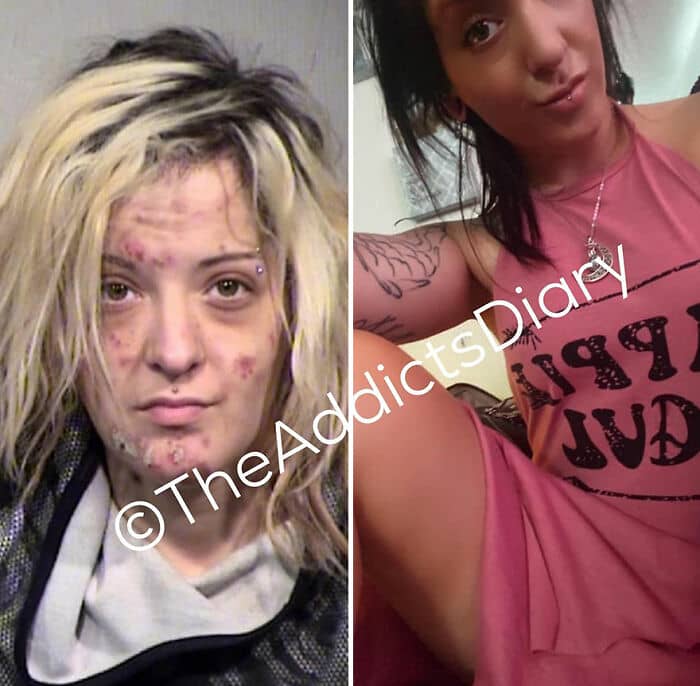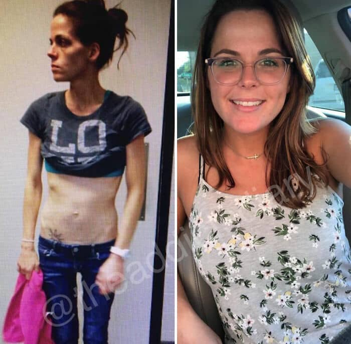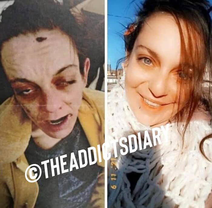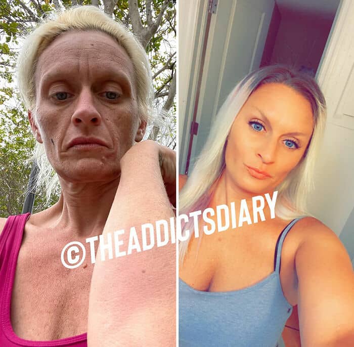 “The photo on the left was taken in 2014. I was 79 pounds and just got out of the hospital after being on life support for a month. I was a*** to any and EVERY thing from buying lighters, gambling, organizing, to 90+ pills a day. To the right is a picture of me today—happy, joyous, and free!”