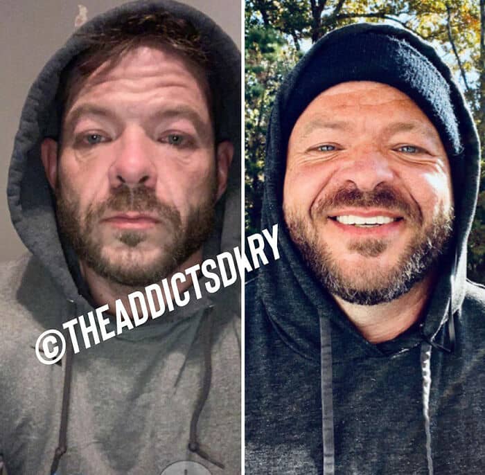 “Two pictures exactly a year apart. I don’t know if anyone else gets as happy as I do when I can see the drastic changes that happen to one’s physical appearance in recovery. Not to mention, my mentality, maturity, and overall positive outlook on life in general. If you don’t feel like change is possible, I am here to tell you THAT IS A LIE!”