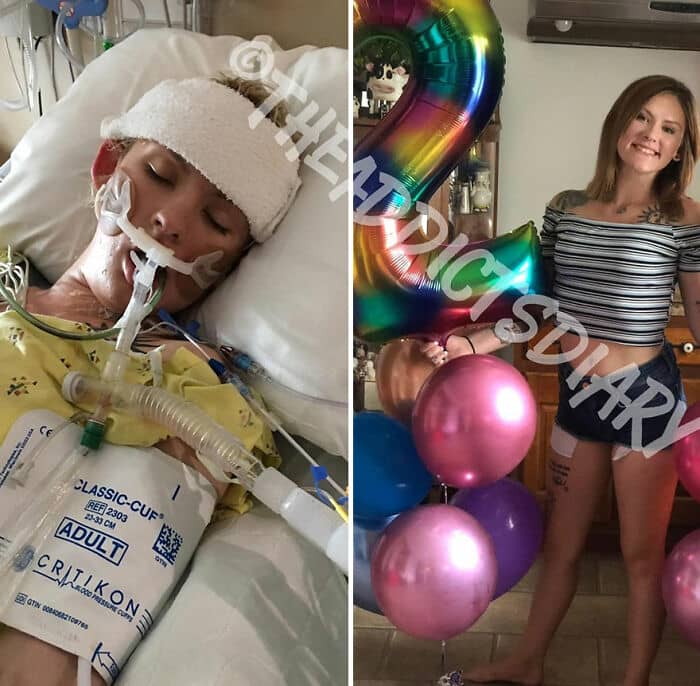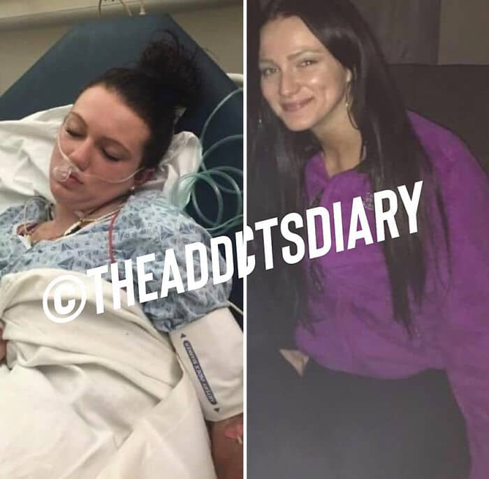 “The picture on the left is the last picture I have of myself before being admitted into the hospital for the 4th time with endocarditis (and actually staying). I was a straight j***, using anything and everything I could get my hands on. It’s hard to look back at what I once was, but I am thankful for that girl because she taught me so much.”