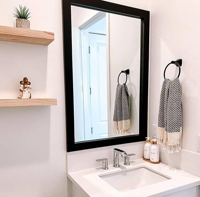 Review: “LOVE the look of my shelves and the pricing! You have the option of putting the metal brackets below as well, instead of having the wood rest in/on them. After some debating I chose to have them rest. It was also the easier option and I was impatient and excited to get these up. These were perfect for my bathroom and would be perfect for any area really. I do not have a lot of counter space in my bathroom, so these were perfect for organizing and styling functionally. Thank you!” – Libby Pelletier
