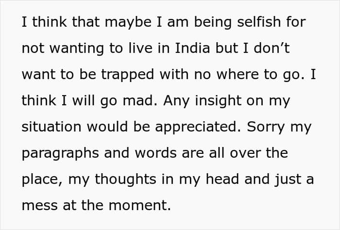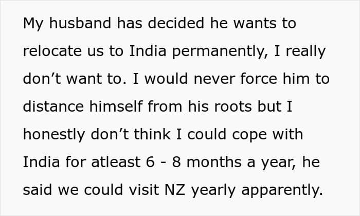 OP’s past visits to India have been challenging. Living in a rural area, she couldn’t go anywhere alone and had to follow strict cultural expectations. Wearing what she liked wasn’t an option, and even small choices—like what to eat or watch on TV—led to judgment from her husband’s family. While OP respects her husband’s culture, she fears losing her individuality and independence.