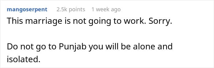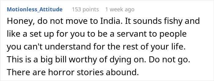 In the comments, readers warned the woman not to go to India and expressed concern over her husband’s patriarchal tendencies