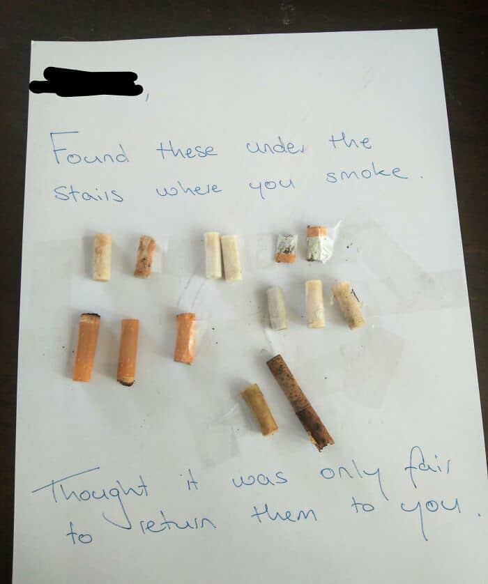 #36 Pos Neighbor Smokes On Balcony Outside Our Unit And Dumps His Butts On The Ground. Thought This Was An Fun Way To Address The Issue (Taped Note To His Front Door)